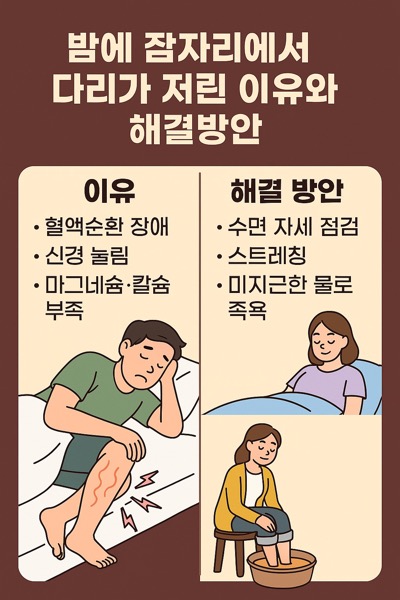 이 글에서는 밤에 다리가 저린 이유와 그에 대한 효과적인 해결방법을 상세히 안내드리겠습니다.